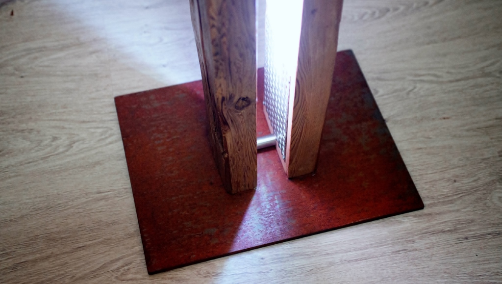Die von Hand gefertigte Stehlampe kombiniert heimisches, naturbelassenes Eichenholz mit modernen Materialien wie Edelstahl, Zinkblech, Kupferblech zu einer zeitlosen und eleganten Designerleuchte.